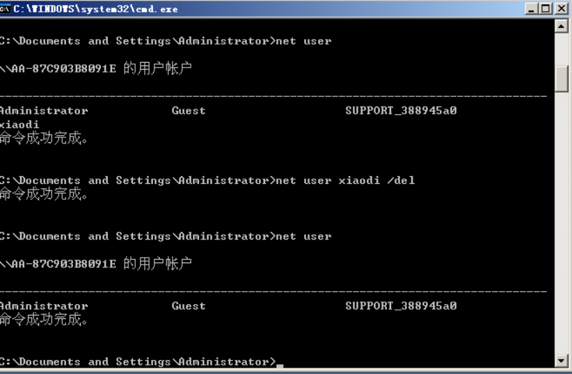 net user xiaodi /del删除用户名为xiaodi的用户