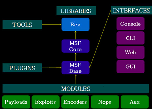Metasploit Framework并不止具有exploit(溢出)收集功能,它使你专注于创建自己的溢出模块或者二次开发。很少的一部分用汇编和C语言实现,其余均由ruby实现。总体架构: