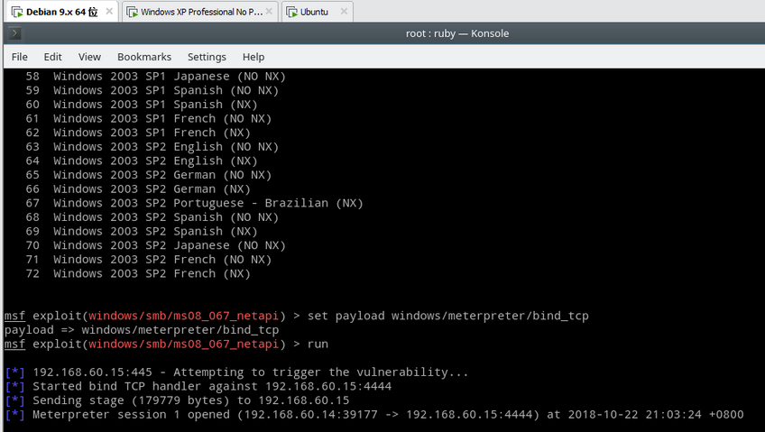 使用use命令调用MS08067漏洞攻击程序