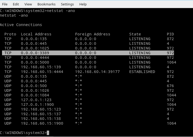 使用netstat -an命令查看端口是否开放,从图中可以看到已经开放3389端口。