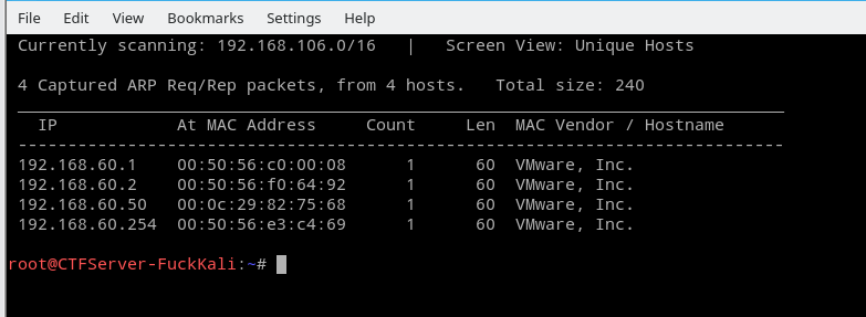 一、在攻击者机器上,使用Nmap或netdiscover工具扫描子网的机器,发现靶机的IP地址。【实验中,大家环境不同,发现的IP地址和图中不一定一致】