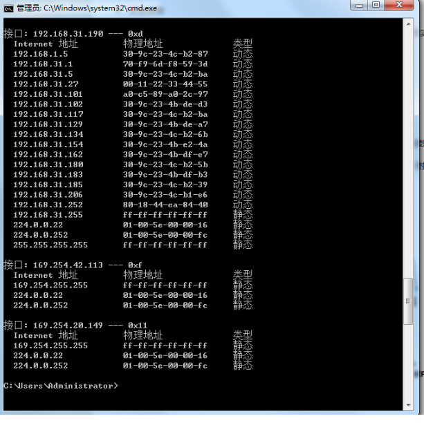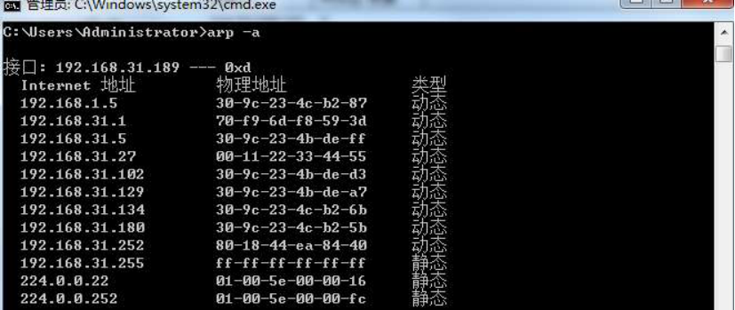 下图为欺骗开始后在192.168.1.189机器上用arp –a命令查询本机arp缓存表的情况,会发现缓存表中的网关对应的MAC地址变成了192.168.1.190号机(实施ARP欺骗的机器)的IP地址