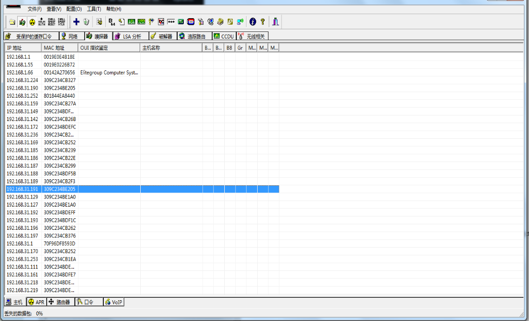 3、点选工具栏中的网卡图标,之后选择sniffer页,再选择左下角的hosts,右键选择“scan MAC address”,扫描局域网中的活动主机IP及MAC地址除网关外,扫描到了攻击目标192.168.31.189和192.168.31.190