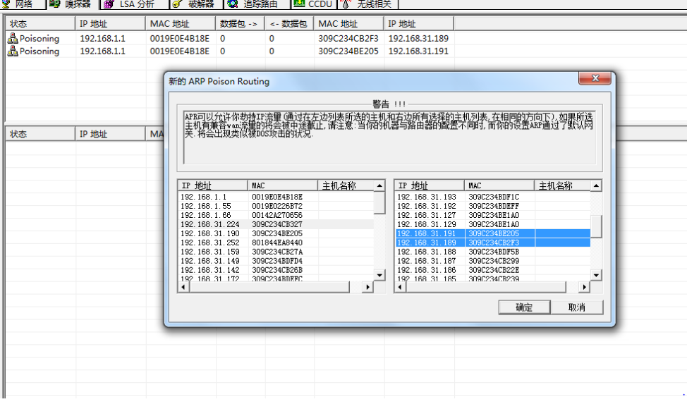 3、选中ARP页->点下列表栏空白处,大加号变为可选->点大加号,在弹出的窗口中选择要嗅探的目标主机(注意这里的选择和单击欺骗嗅探不一样,左面直接点网关,其它机器自动出现在右侧列表中,这时需要按住ctrl键在右侧选择你需要嗅探的主机,如图所示)