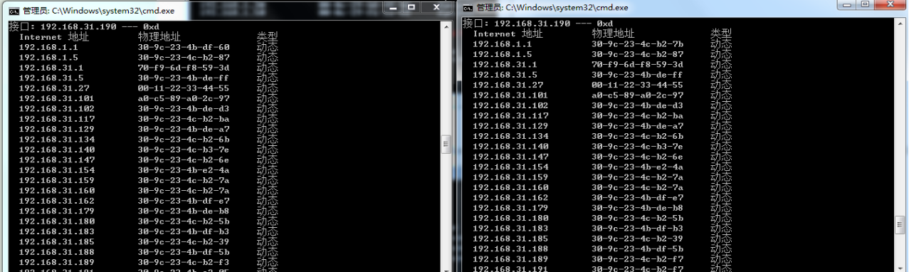 2.欺骗攻击前后,通过Arp-a命令验证欺骗是否成功(附截图)