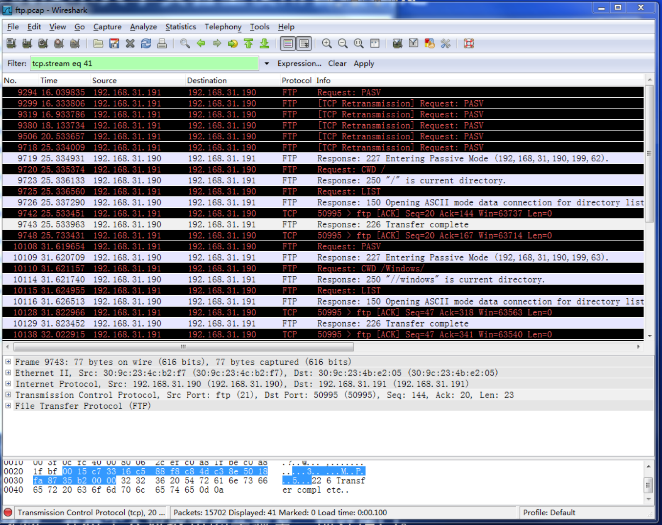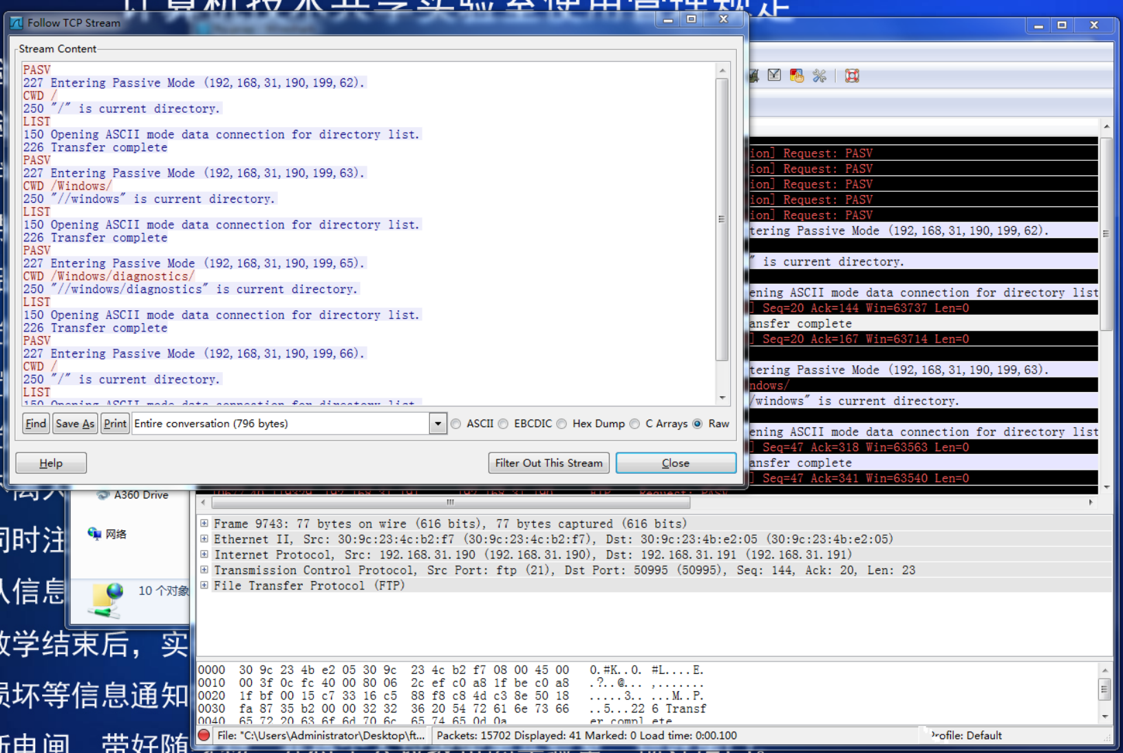 4.B同学停止Wireshark抓包,并和A同学一起分析数据包中的FTP登录过程,还原登录用户名和密码,以及上传文件。