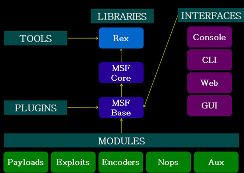 Metasploit Framework并不止具有exploit(溢出)收集功能,它使你专注于创建自己的溢出模块或者二次开发。很少的一部分用汇编和C语言实现,其余均由ruby实现。总体架构: