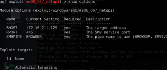 从图中可以看到还需设置RHOST(目标地址)、Exploit target(攻击目标)使用 set 命令设置 Module Options,此处需要设置目标IP即 set RHOST 172.16.211.129