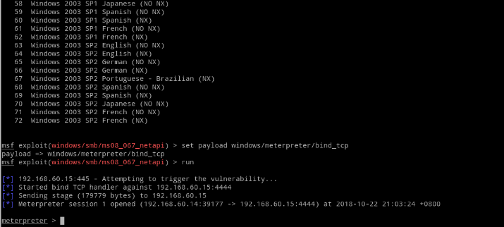 使用use命令调用MS08067漏洞攻击程序