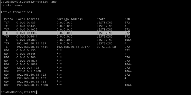 使用netstat -an命令查看端口是否开放,从图中可以看到已经开放3389端口。