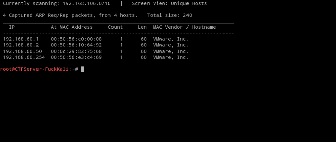 一、在攻击者机器上,使用Nmap或netdiscover工具扫描子网的机器,发现靶机的IP地址。【实验中,大家环境不同,发现的IP地址和图中不一定一致】