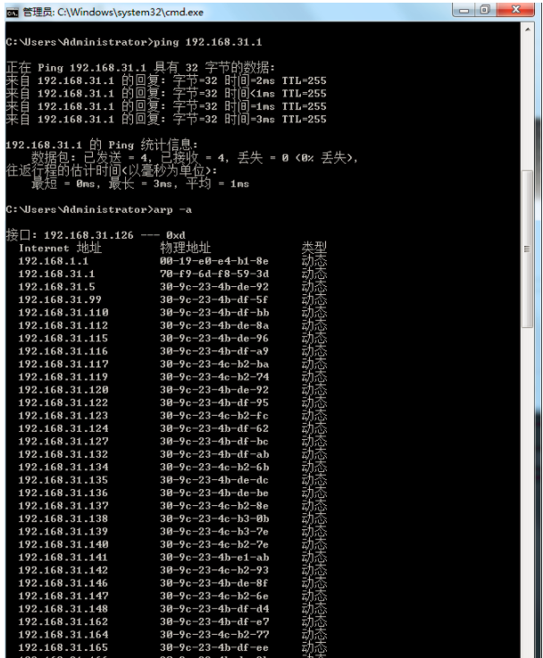 下图为欺骗开始后在192.168.31.126机器上用arp –a命令查询本机arp缓存表的情况,会发现缓存表中的网关对应的MAC地址变成了192.168.1.127号机(实施ARP欺骗的机器)的IP地址