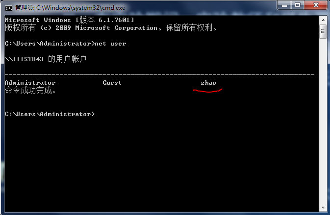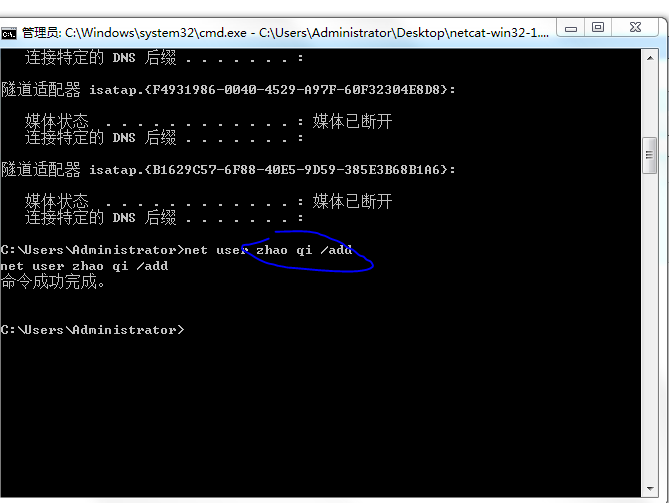 在shell中,利用net user zhao qi /add ,添加一个用户,用户名为zhao 密码为 qi并在受害者的机器中使用 net user 命令进行验证。