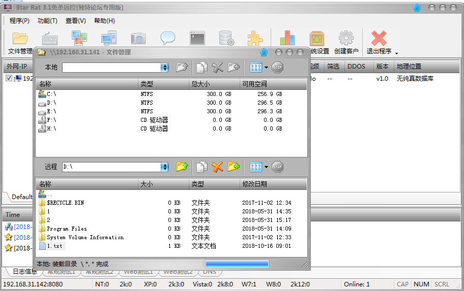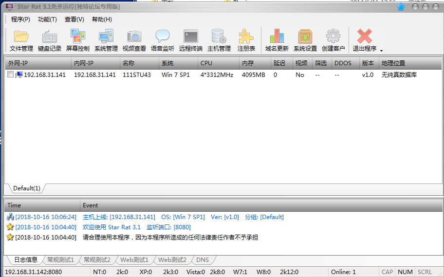 在控制端中查看木马上线情况,并对以下功能每个进行测试和截图。