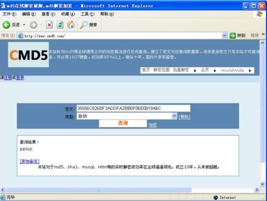 1. 请解密以下字符串35556C826BF3ADDFA2BB0F86E0819A6C。(附截图)