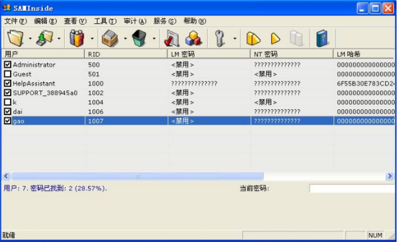 3.使用saminside软件将sam.txt导入,并进行破解,注意配置字典破解和暴力破解