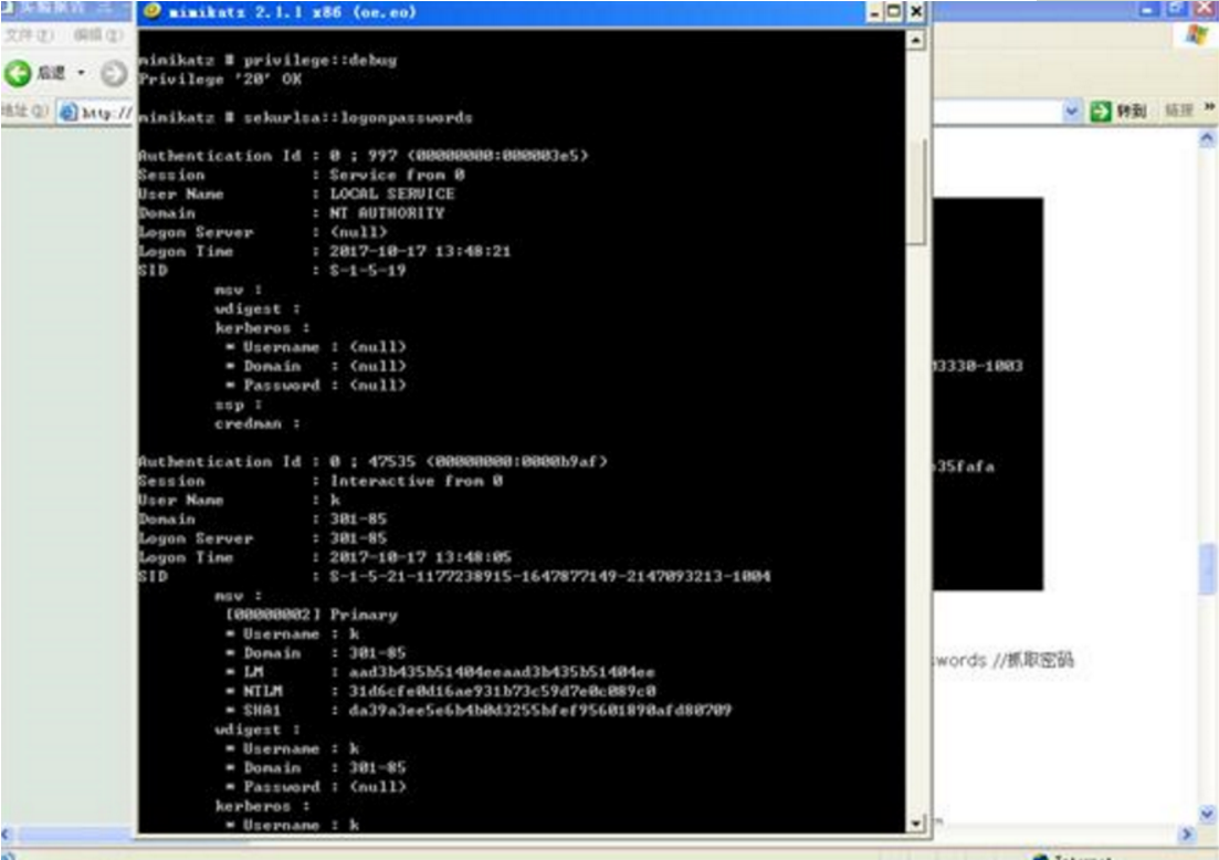 使用minikatz工具对系统的密码进行提取,涉及两条命令