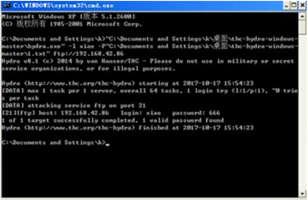 2.B同学使用hydra 对ftp用户的密码进行字典破解。hydra 中有关于该软件的使用命令语法。字典文件需要自己去生成。