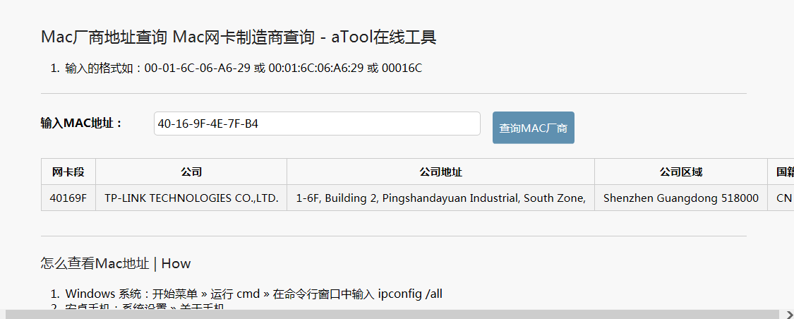 在一个案件中,获取了犯罪嫌疑人的一个MAC地址:40-16-9F-4E-7F-B4,请查询该MAC地址对应的厂商是(附截图)