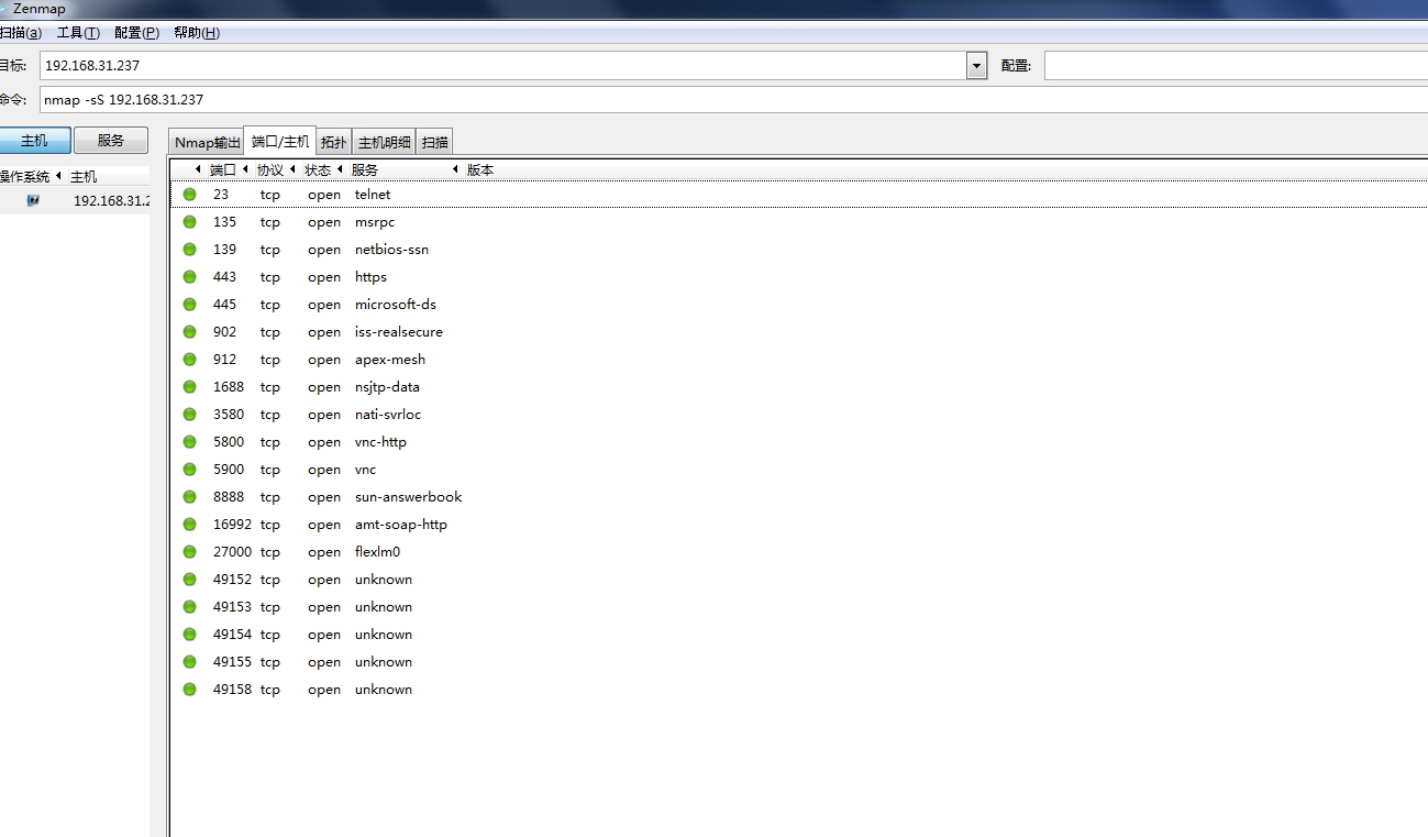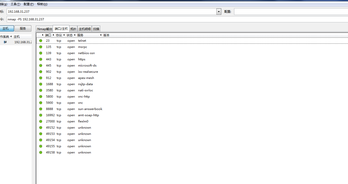 选择一个存活IP地址,扫描所开放的端口(分别用ping扫描,syn扫描尝试),并查询常用端口所对应的服务及操作系统信息。