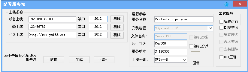 步骤二: 点击菜单栏中的“服务生成”,在弹出的配置服务端中,配置回连IP地址(攻击者IP)和端口号,并点击“生成”按钮,生成木马服务端。