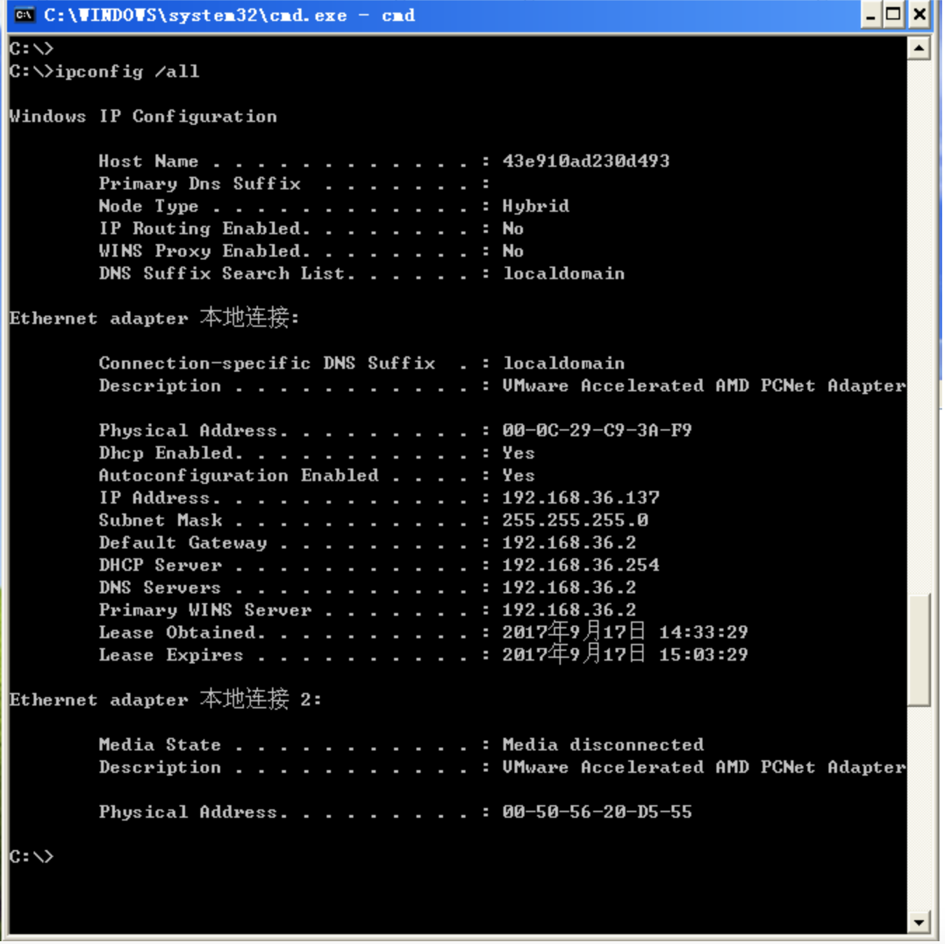 安装windows和linux(kali)两个虚拟机,均采用NAT网络模式,查看主机与两个虚拟机器的IP地址,并确保其连通性。同时为两个虚拟机做一个快照