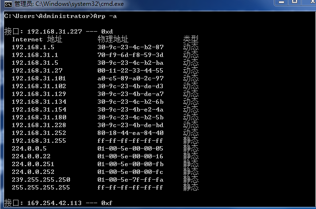 下图为欺骗开始后在192.168.1.30机器上用arp –a命令查询本机arp缓存表的情况,会发现缓存表中的网关对应的MAC地址变成了192.168.1.50号机(实施ARP欺骗的机器)的IP地址