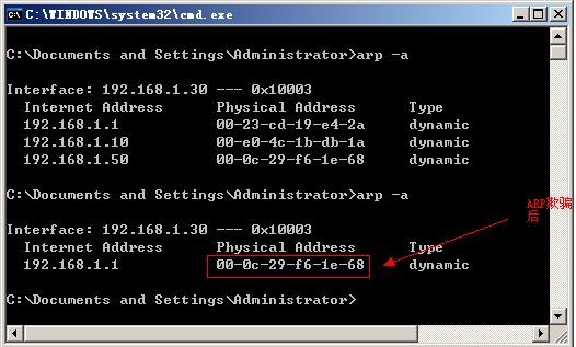 2.欺骗攻击前后,通过Arp-a命令验证欺骗是否成功(附截图)