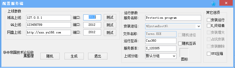 步骤二: 点击菜单栏中的“服务生成”,在弹出的配置服务端中,配置回连IP地址(攻击者IP)和端口号,并点击“生成”按钮,生成木马服务端。