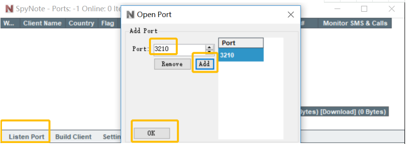 点击Listen Port,在弹出的对话框中输入端口号,并点击Add按钮,最后点击OK,成功监听本地端口。【本过程选用3210端口,实验过程大家可以自己选择端口】