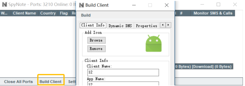 (2)配置回连IP和端口,IP地址填写运行spynote的机器IP,端口填写监听的端口号,本次填写3210端口。