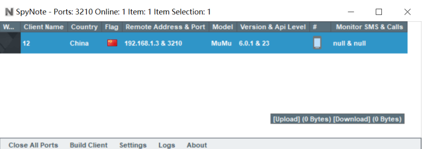 可以在spynote中看到有一台机器上线,并可以查看其基本信息。