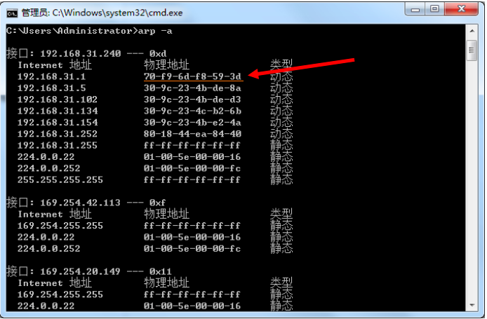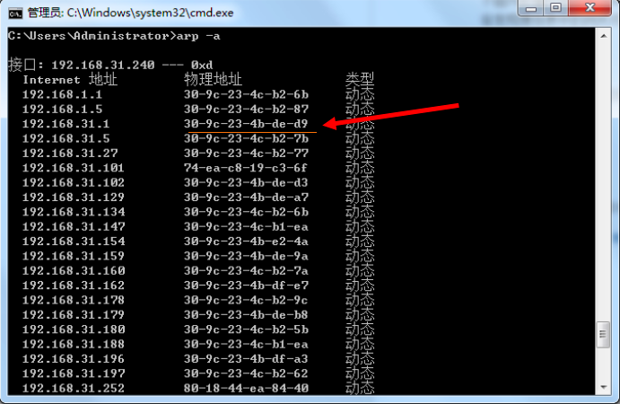 下图为欺骗开始后在192.168.31.240机器上用arp –a命令查询本机arp缓存表的情况,会发现缓存表中的网关对应的MAC地址变成了192.168.31.239号机(实施ARP欺骗的机器)的IP地址