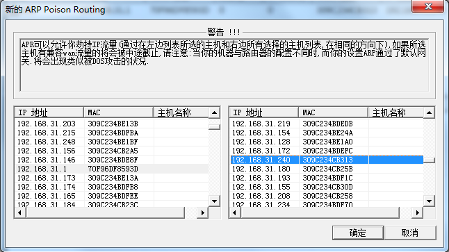 3、选中ARP页-》点下列表栏空白处,大加号变为可选-》点大加号,在弹出的窗口中选择要嗅探的目标主机(注意这里的选择和单击欺骗嗅探不一样,左面直接点网关,其它机器自动出现在右侧列表中,这时需要按住ctrl键在右侧选择你需要嗅探的主机,如图所示)