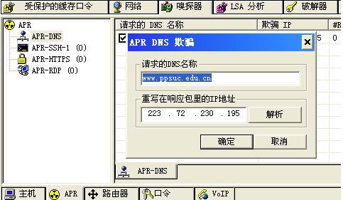 3.B同学扮演攻击者,设计攻击方法,使用CAIN,通过DNS欺骗的方式,让A同学访问www.ppsuc.edu.cn网址的时候,访问到另外一台机器上的伪造网站