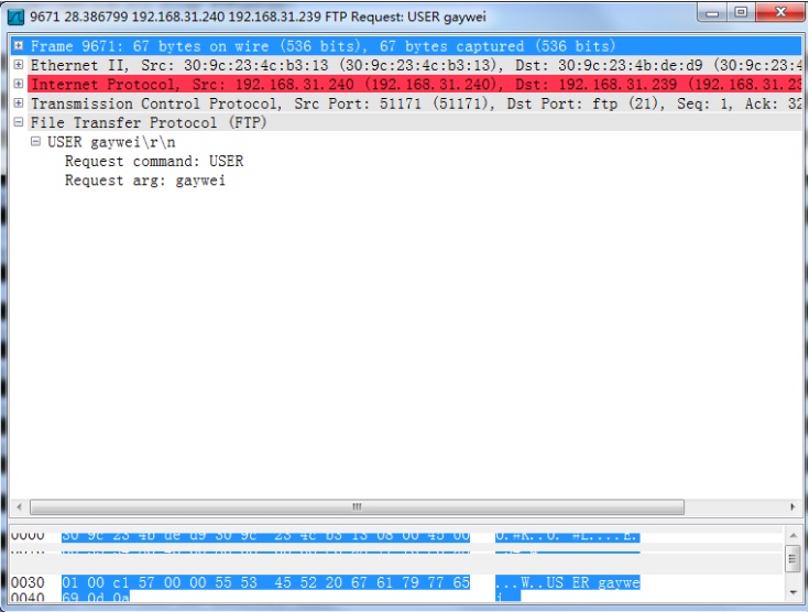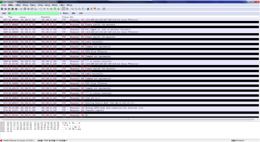 4.B同学停止Wireshark抓包,并和A同学一起分析数据包中的FTP登录过程,还原登录用户名和密码,以及上传文件。
