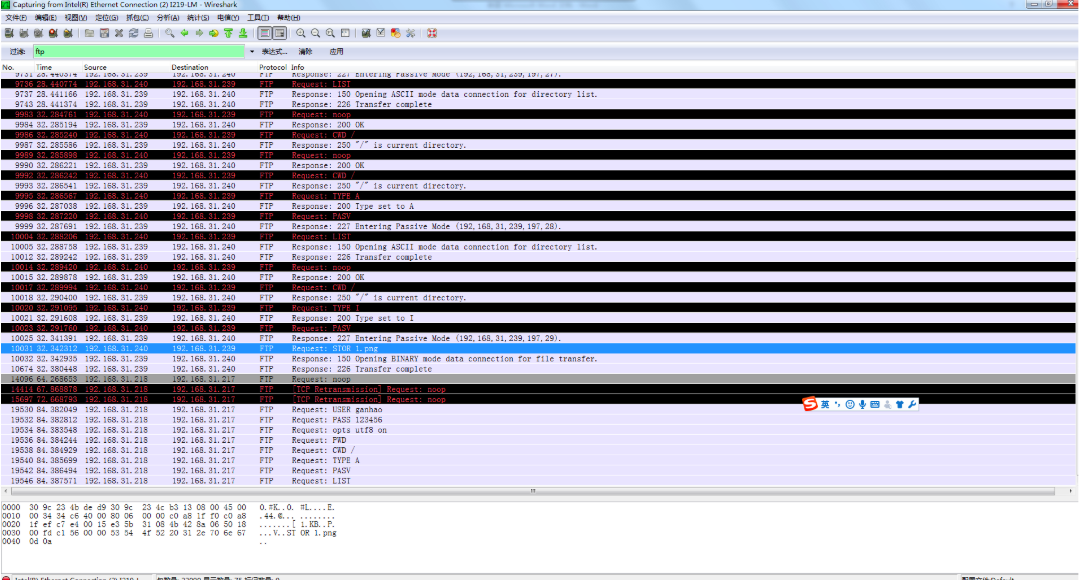 3.B同学在机器中安装Wireshark,并将其打开;之后用用户名和密码登陆A同学的FTP服务器,并上传一张图片。