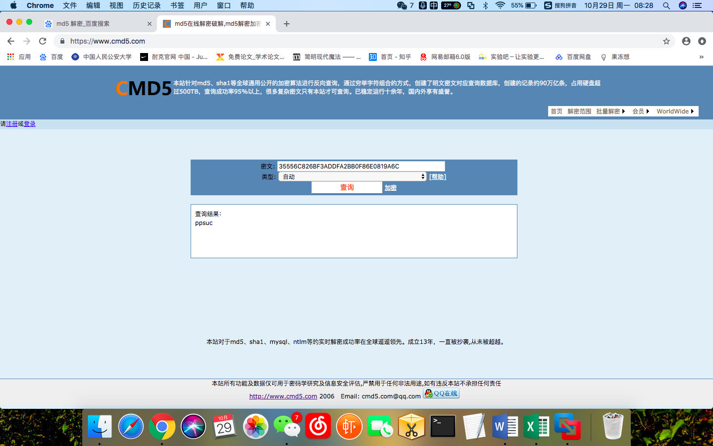 1. 请解密以下字符串35556C826BF3ADDFA2BB0F86E0819A6C。(附截图)