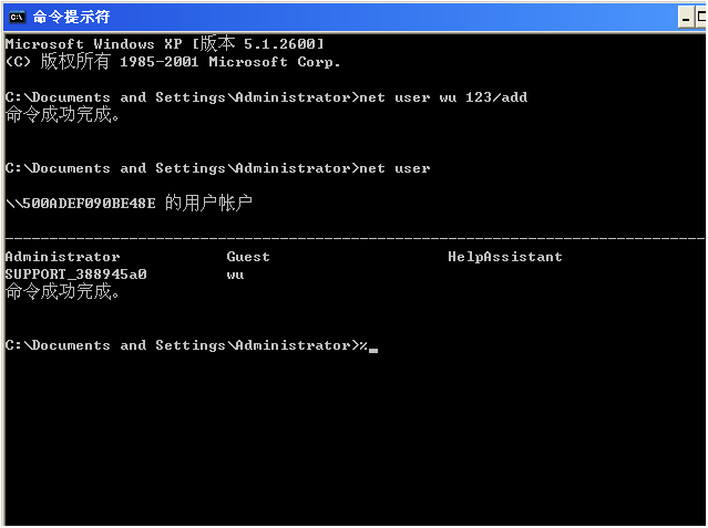 1.在windows xp系统中使用 net user gao gao123 /add添加用户gao,密码gao123的账户(用户名和密码可以自己设定);并使用net user命令确定用户添加成功。