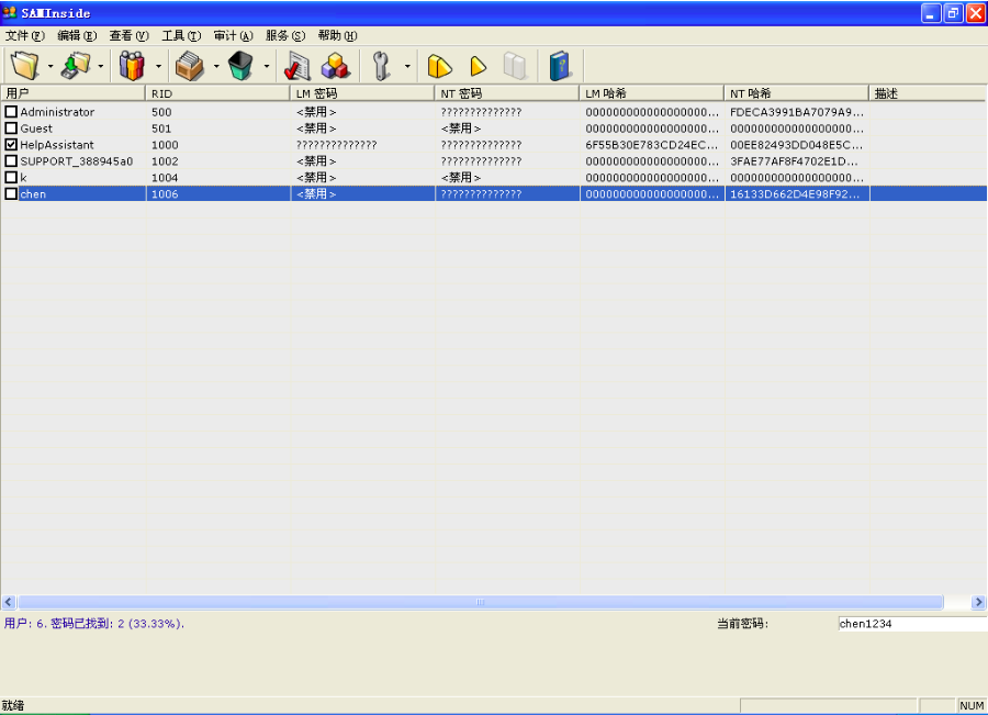 3.使用saminside软件将sam.txt导入,并进行破解,注意配置字典破解和暴力破解
