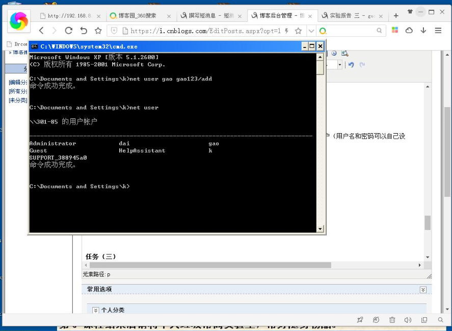 1.在windows xp系统中使用 net user gao gao123 /add添加用户gao,密码gao123的账户(用户名和密码可以自己设定);并使用net user命令确定用户添加成功。