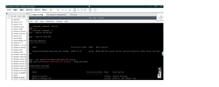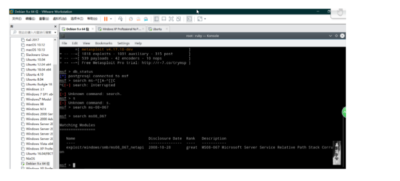 在msfconsole使用search命令搜索MS08067漏洞攻击程序